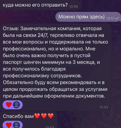 Замечательная компания, которая была на связи 24/7, терпеливо отвечала на все мои вопросы и поддерживала не только профессионально, но и морально. Мне было очень важно получить в пустой паспорт шенген минимум на 3 месяца, и все получилось благодаря профессионализму сотрудников. Обязательно буду рекомендовать и в целом продолжать обращаться за услугами при дальнейшем оформлении документов. Спасибо вам!